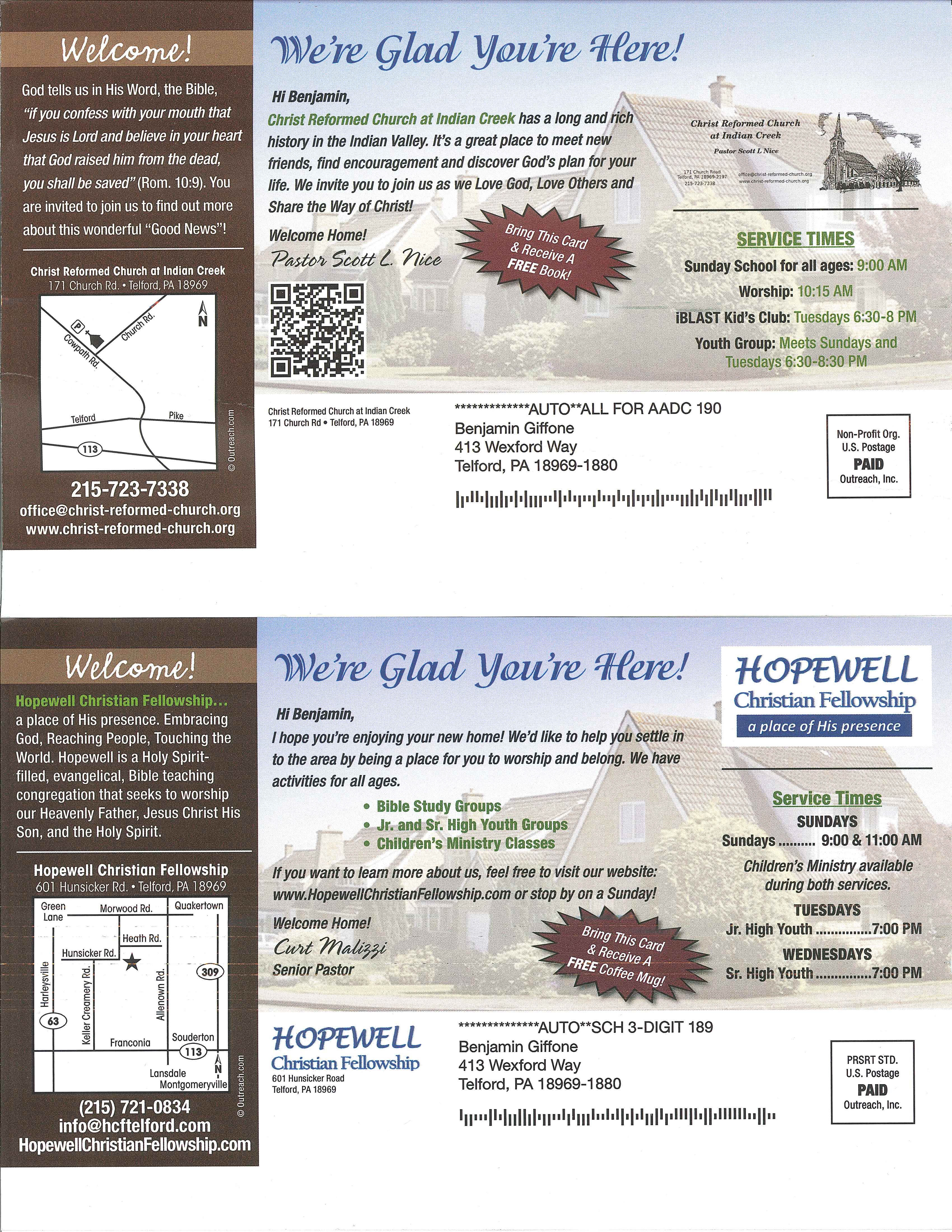 At first glance, I thought, “Why would a church send two ‘welcome to the neighborhood’ fliers to the same address, one for the wife and one for the husband?” But upon further review, I saw that both were addressed to me.